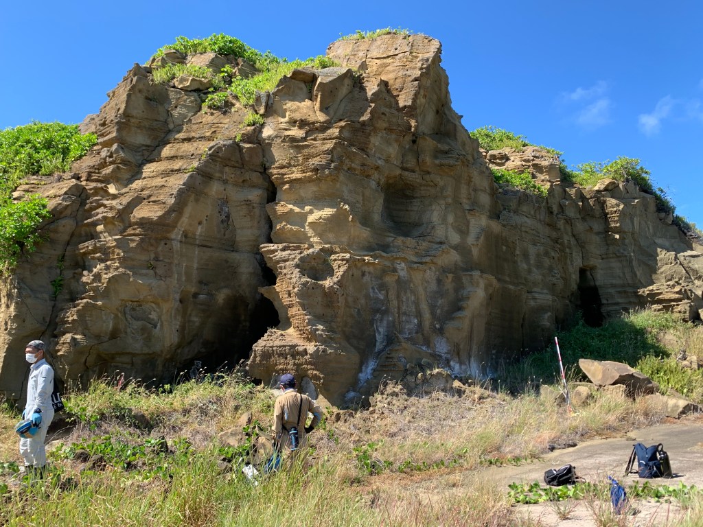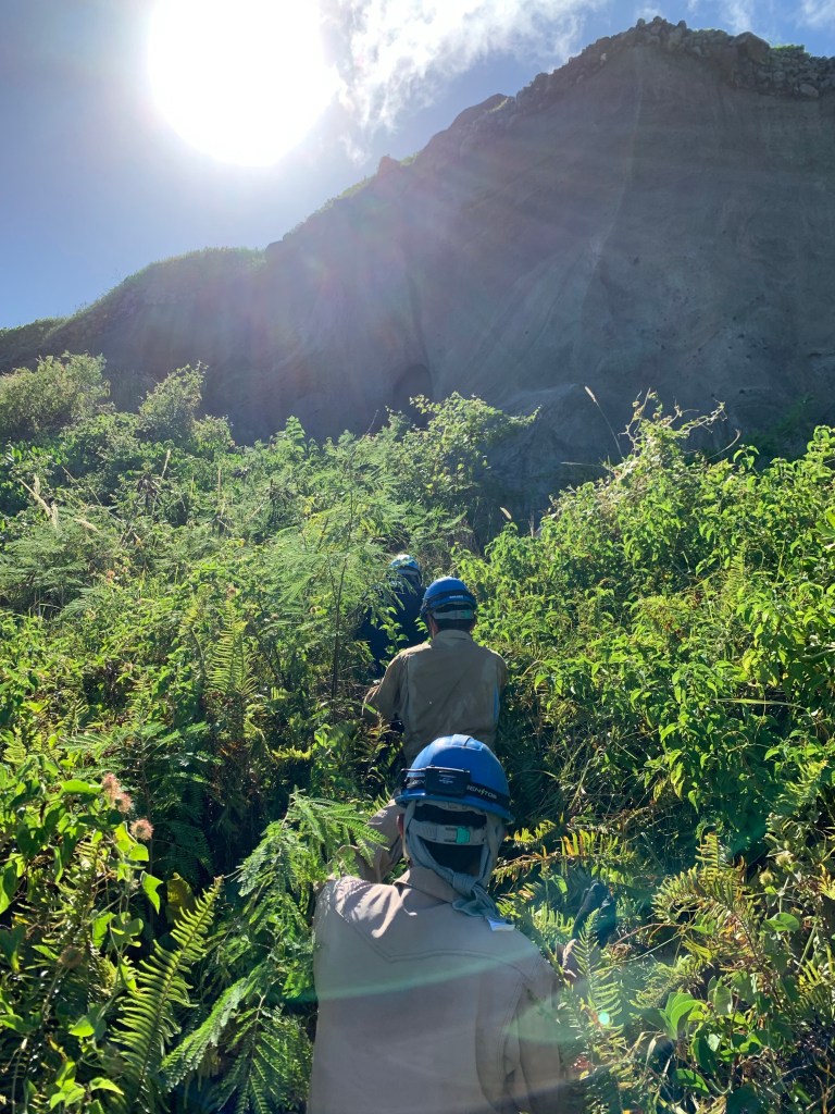 同じルートをたどり、再び匍匐前進で狭い通路を抜けると、改めて望める摺鉢山の麓の上陸海岸。