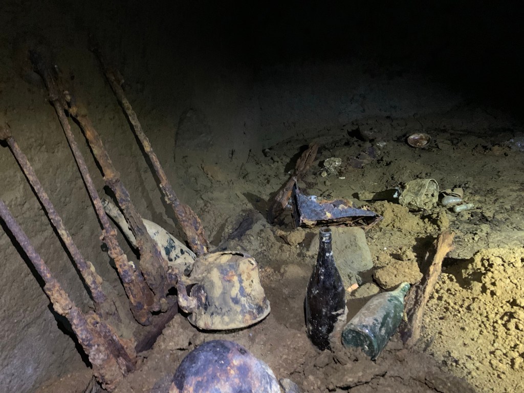 武器や鉄帽、食器類や何かの薬品なども生々しく残されています。