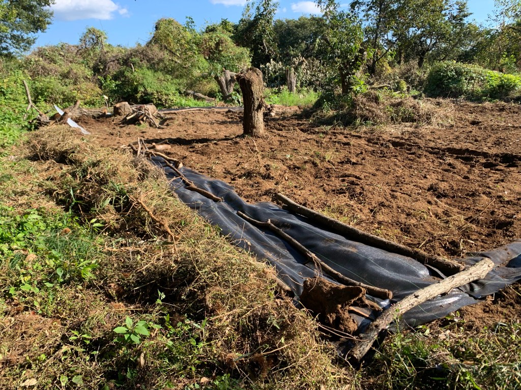 必要な面積、エリアを決めたら防草シートを敷設して、その外側を雑草マルチ(枯れ草や残渣で覆って雑草を生えなくする方法)で囲う。