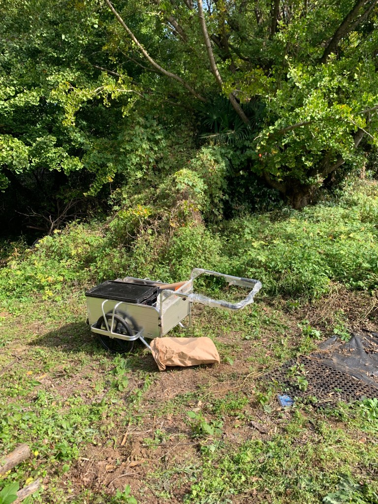 前回は目印のつもりでおいた木の枝が完全に飲み込まれた結果、刈払機を何度も木にブッ刺して刃や機械に負担をかけてしまってたので、中途半端な目印は取っ払いました。